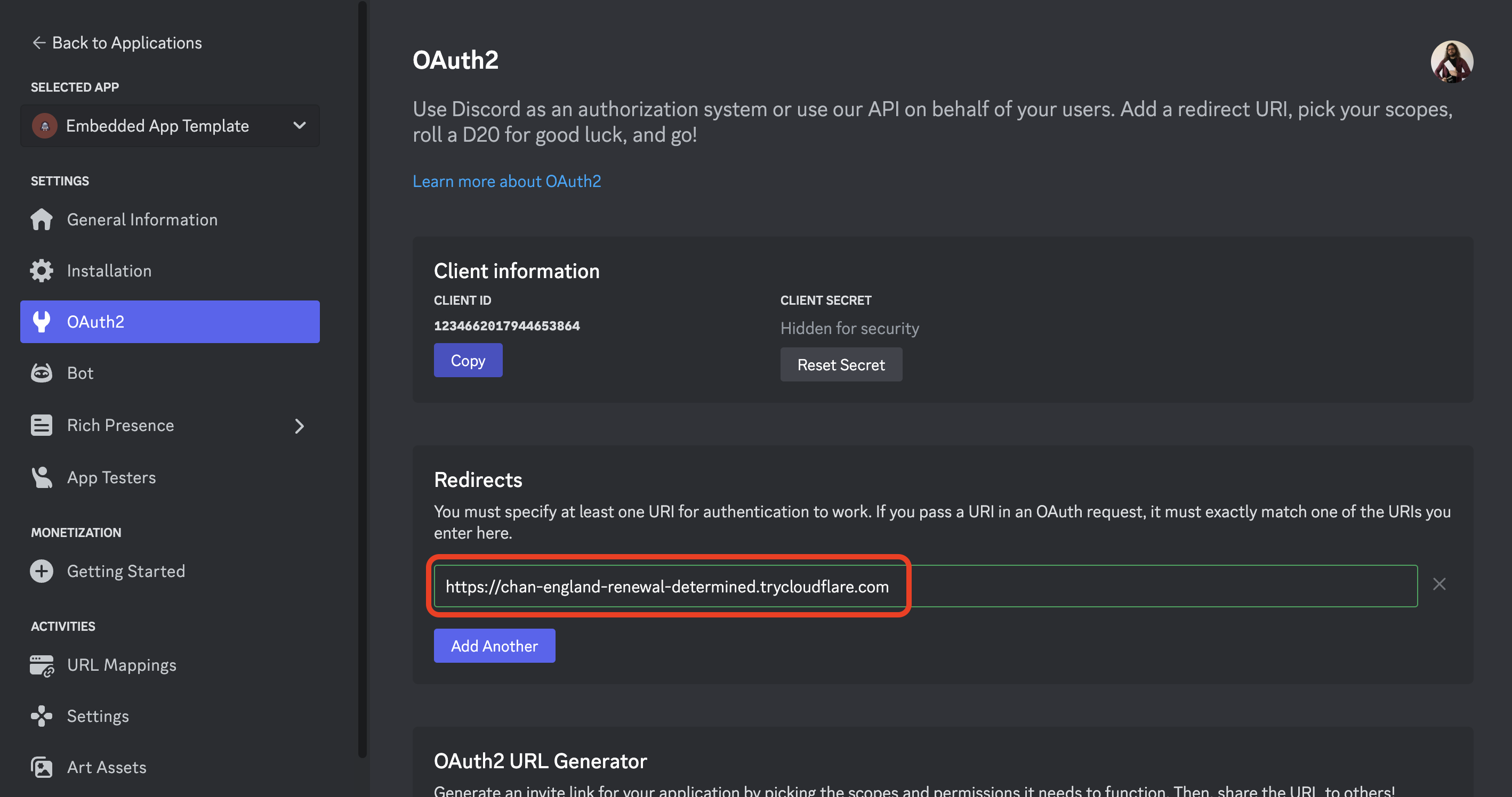 Each time you run cloudflared, it will generate a new URL. Be sure to update your Discord Activity’s “OAuth2 → Redirect URL” and “URL Mappings → Target” to the new URL.